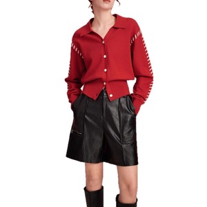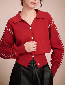 ELLE同款法式红色设计感翻领针织开衫女秋季新款新年软糯毛衣上衣