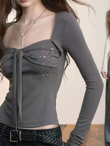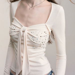 韩系风蝴蝶结针织彩色烫钻小衫女秋季修身百搭u领系带T恤辣妹上衣