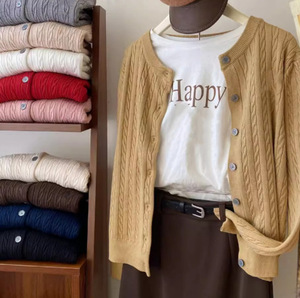 刺绣麻花针织开衫女秋冬早春复古圆领红色白色毛衣外套