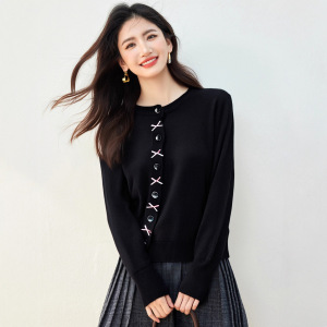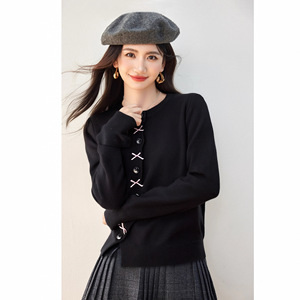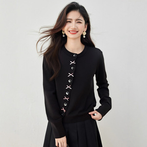 黑色针织衫女2025秋季新款韩系设计感蝴蝶结开衫毛衣外套上衣