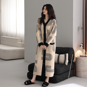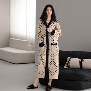 半边绒和服领V领开衫长袖睡裙冬季长款连衣裙加厚保暖外穿家居服