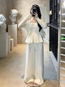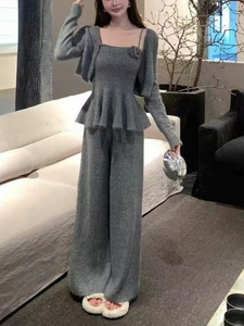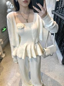 小香风毛衣套装裤女复古针织开衫荷叶边收腰吊带高腰阔腿裤三件套