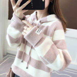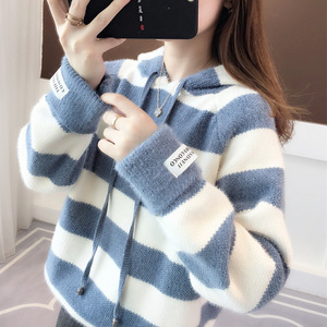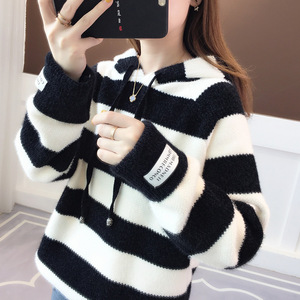 连帽套头雪尼尔毛衣秋冬新款条纹学生外穿针织衫宽松简约卫衣外套