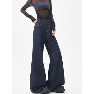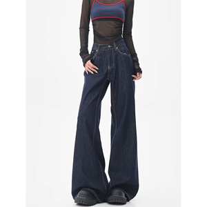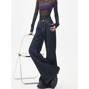 KEN1STUDIO美式复古深蓝阔腿牛仔裤女夏季新款高腰直筒宽松微喇裤