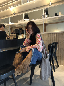 肌理感彩色条纹圆领长袖t恤女秋季松弛休闲气质慵懒宽松百搭上衣
