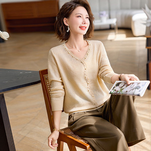妈妈秋装2025新款针织上衣中老年春秋时尚气质V领打底衫百搭毛衣