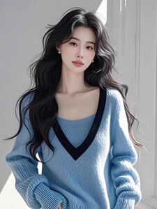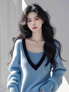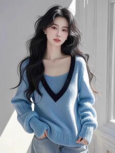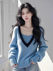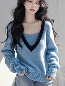 韩系蓝色v领假两件长袖针织衫女毛衣早秋流行穿搭单穿撞色上衣
