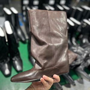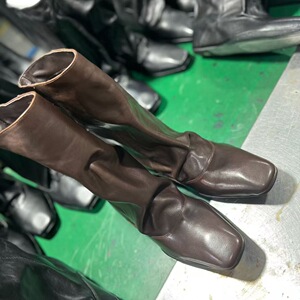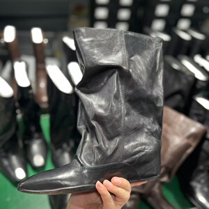 牛皮版~小众新款内增高方头宽松套筒中筒靴女时尚短靴时装骑士靴