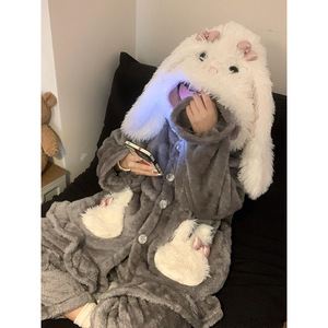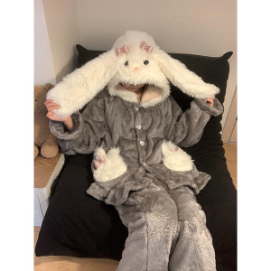 甜美软萌系兔耳朵连帽珊瑚绒睡衣女秋冬季毛绒绒保暖家居服两件套
