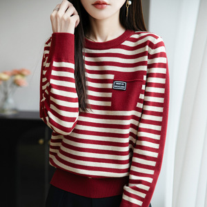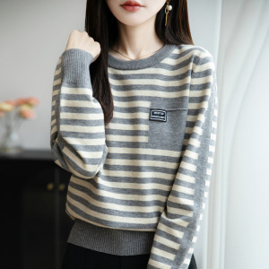 法式撞色条纹圆领针织衫女2025秋冬新款设计感宽松保暖打底衫毛衣