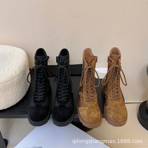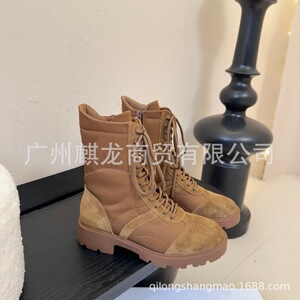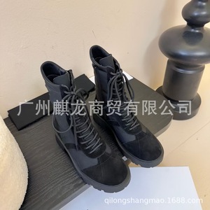 高端2025秋冬凯旋门真皮圆头拼色复古粗跟绑带侧拉链马丁靴机车靴