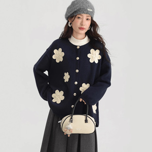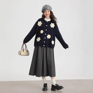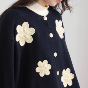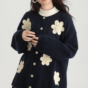 跨境大码日韩风秋季新款圆领单排扣立体刺绣花朵设计感针织外套女