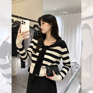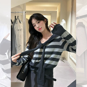 卡其色短款v领假两件长袖针织衫飘带海军领早秋气质叠穿修身上衣