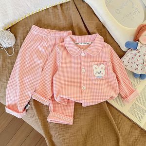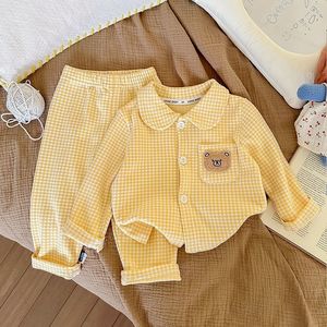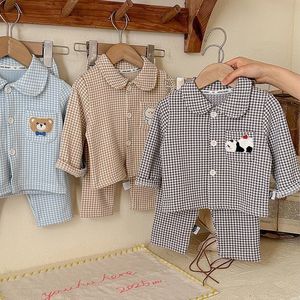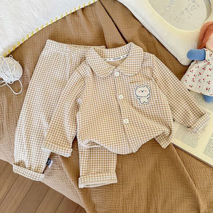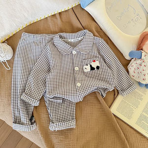 秋季儿童家居服长裤套装男童新款德绒长袖格子睡衣宝宝女童翻领