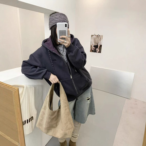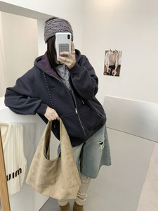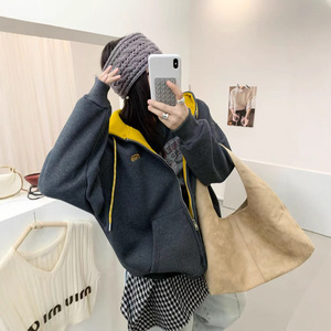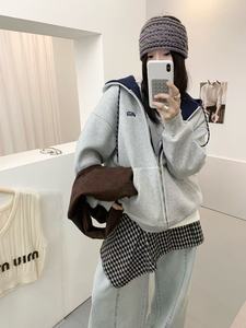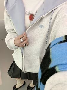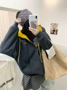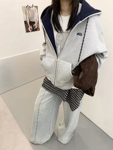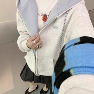 韩系小众emis连帽长袖撞色卫衣女 慵懒宽松设计感拉链外套上衣