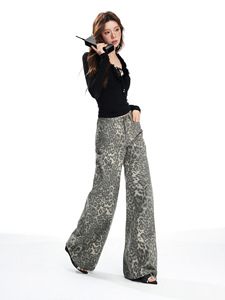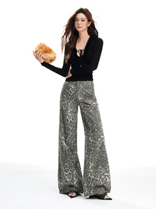 美式复古低腰豹纹牛仔裤女秋冬新款直筒宽松显瘦百搭休闲阔腿裤子