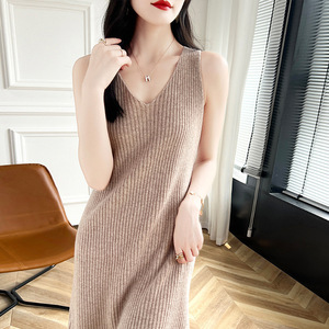 秋冬新款中长款连衣裙 内搭显瘦毛衣v领韩版慵懒风显瘦针织背心裙