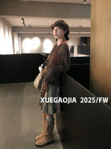 Creambaby Studio 咖色圆领镂空针织罩衫女秋设计感慵懒长袖上衣