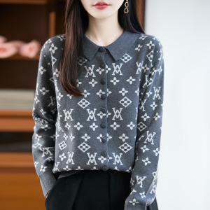 法式复古提花翻领针织开衫女新款显瘦长袖打底衫毛衣外套女装上衣
