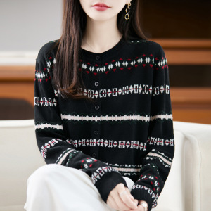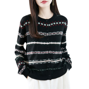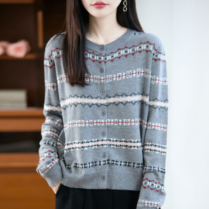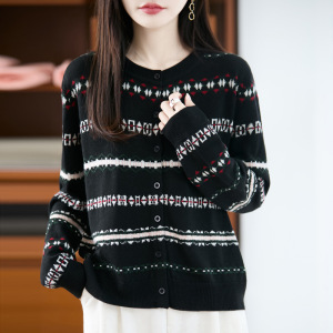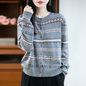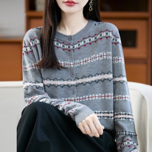 拼色圆领精纺羊毛针织开衫女秋冬圆领长袖毛衣宽松外套女装上衣