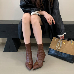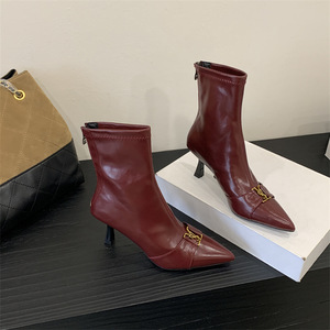 金属扣时装靴2025秋冬新款尖头高跟短靴后拉链气质短筒靴百搭
