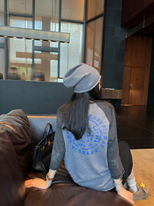 区区欧阳 撞色印花长袖T恤女秋季新款宽松显瘦美式复古圆领上衣
