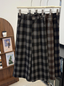 复古磨毛格子八分裤2025秋冬女装松紧腰小个子直筒阔腿裤批发9723