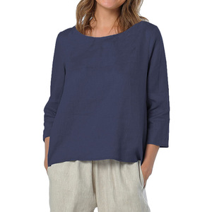 2023独立站亚马逊跨境外贸女装秋季时尚休闲纯色圆领棉麻小衫