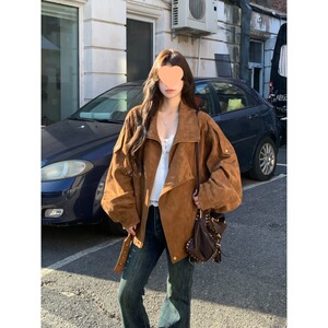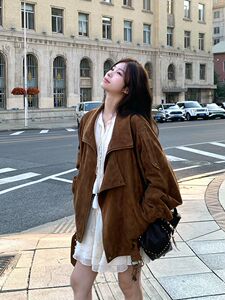 麂皮绒机车外套2025秋季复古美拉德休闲宽松慵懒翻领廓形感夹克女