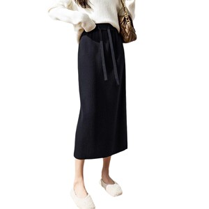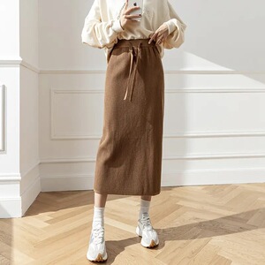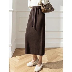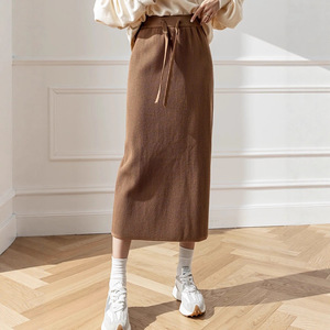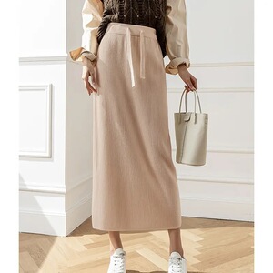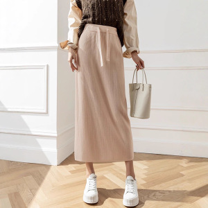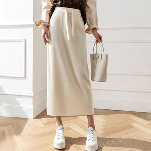 纯色坑条针织半身裙女中长款高腰抽绳系带遮胯包臀裙显瘦直筒裙子