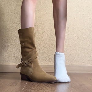 牛皮版~复古风显瘦皮带扣骑士靴女方头绒面搭扣两穿折翻西部靴子