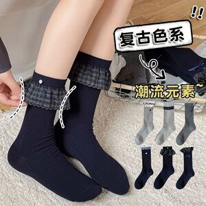 春秋季款百搭miu系芭蕾风皮鞋日系少女长袜格子花边袜子女中筒袜