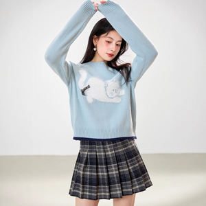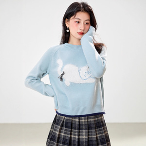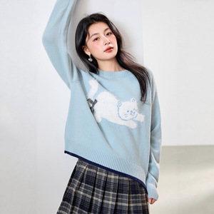 蓝色圆领毛衣女春秋2025新款慵懒风宽松蝴蝶结卡通针织衫别致上衣