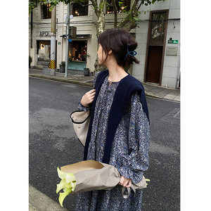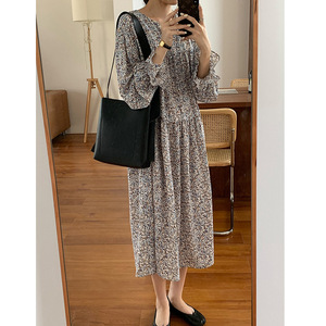 碎花连衣裙2025秋新款女装女宽松韩版遮肚子显瘦系带裙子中长款