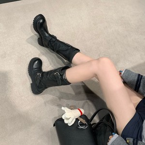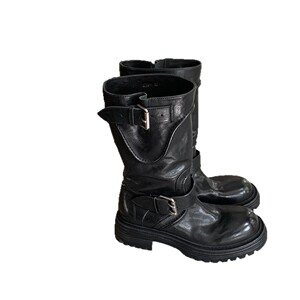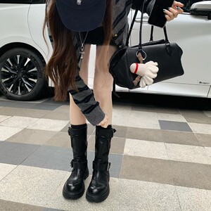 葡萄妈秋冬新款英黎街头~ 水洗马皮酷飒圆头英伦皮带扣厚底骑士靴