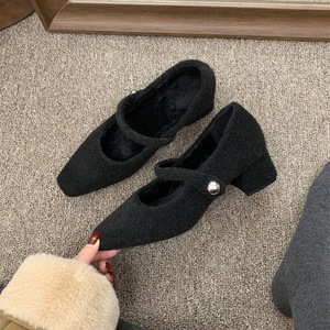方头灰色粗跟单鞋女冬季款法式气质加绒晚晚高跟玛丽珍毛毛鞋