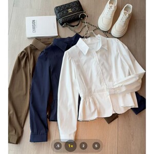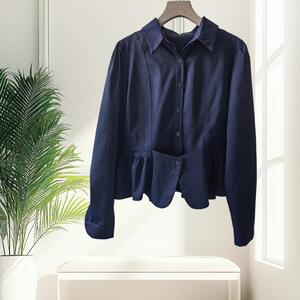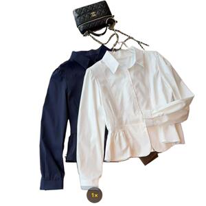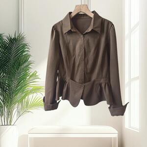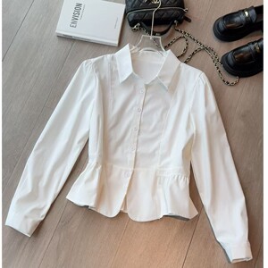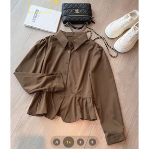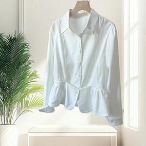 法式优雅翻领秋季压褶外套修身荷叶边下摆长袖女衬衫白色咖啡色