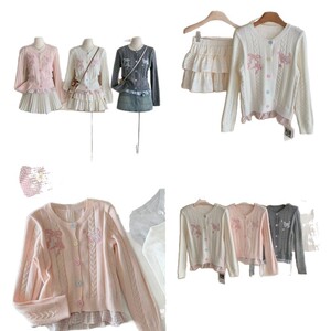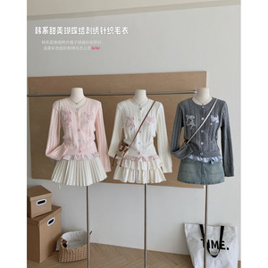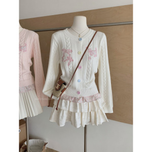 塞纳绞花针织开衫糖果色纽扣猫咪下摆格子拼接毛衣2025秋季新款