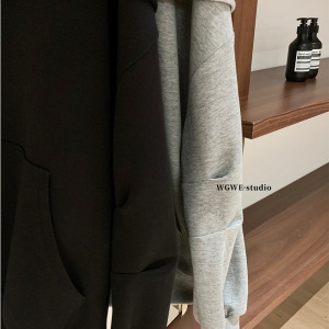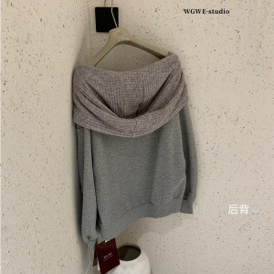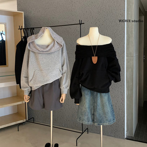 WGWE7288斜肩设计一字领宽松套头连帽卫衣露肩时尚百搭上衣