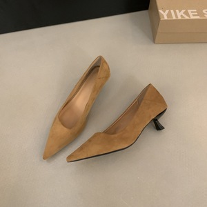 法式尖头小猫跟黑色高跟鞋女2025新款春秋季细跟绒面浅口通勤单鞋