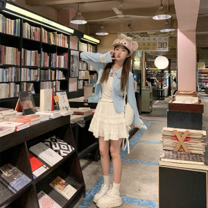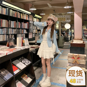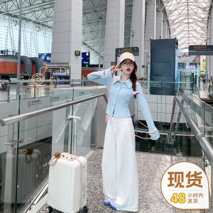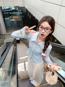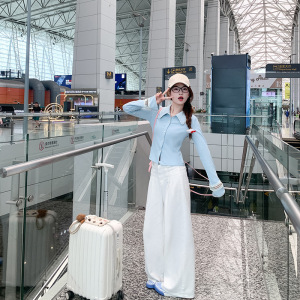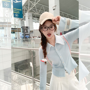 曾小咸 蓝色长袖上衣女早春翻领针织毛衣开衫外套显瘦设计感衣服