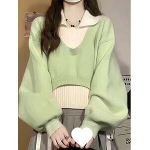 毛衣学院风春秋气质韩系百搭慵懒粉色polo领针织衫两件套短款上衣
