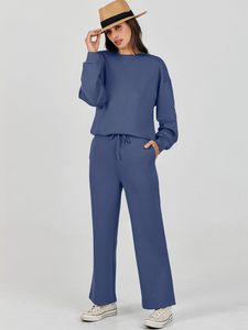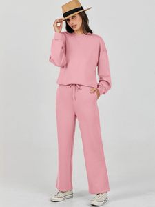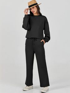 2025跨境欧美风秋冬女装纯色圆领套头长裤女装休闲长袖卫衣套装女