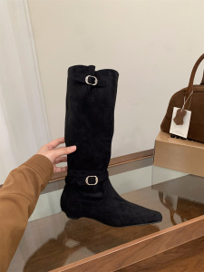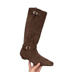 粗跟绒面棕色瘦瘦长筒靴女靴子2025新款秋冬季方头堆堆长靴骑士靴