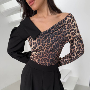 跨境爆款豹纹拼接上衣不对称设计个性又时尚独特摩登风格时尚休闲