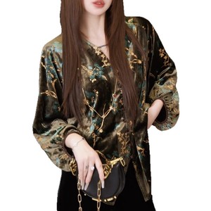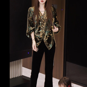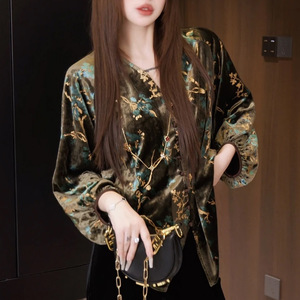 欧货设计感轻奢灯笼袖衬衫上衣新中式秋款显瘦V领长袖提花开衫潮