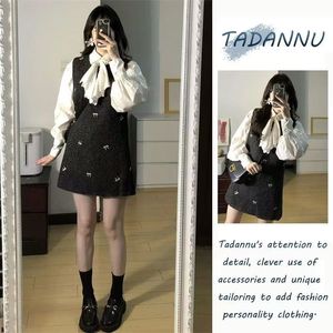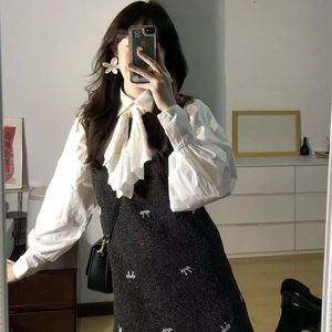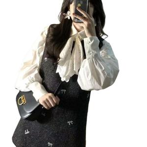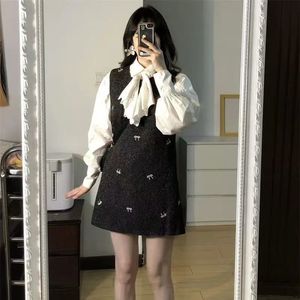 韩系慵懒风超仙包臀蝴蝶结刺绣背心连衣裙女秋冬+白色衬衫两件套