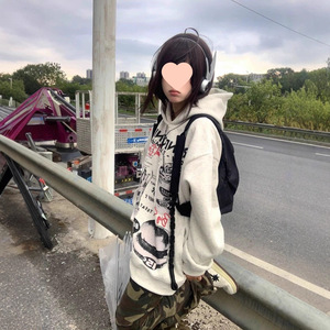 美式复古汉堡薯条印花连帽卫衣女秋冬新款重磅银狐绒外套