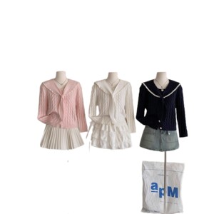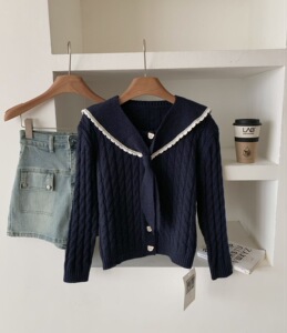 甜美蕾丝花边海军领绑带针织衫女秋韩系少女学院风显瘦修身毛衣