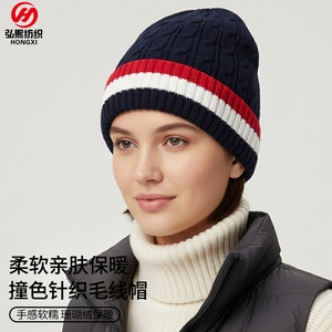 亚马逊冬季帽子男针织帽撞色加绒加厚保暖帽子女珊瑚绒内里帽子男